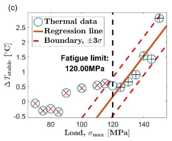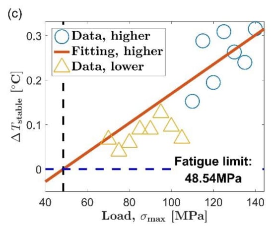 The new method proposed in this paper is to determine the fatigue limit based on the distance between the data point from the to the fitting line, which is an evaluation strategy different from the Risitano method []. The two boundary lines are respectively arranged on both sides of the fitting line to the initial set. When the self-heating increases rapidly with the load, the first data point that does not belong to the microplastic dissipation will appear above the boundary line corresponding to positive three times the standard deviation. This is the case in Figure 7a–c and Figure 8a,b. When the self-heating increases slowly with the load, the first data point that does not belong to the microplastic dissipation will appear below the boundary line corresponding to minus three times the standard deviation, similar to the situation in Figure 8c. Using the new method to evaluate the fatigue limit is basically not affected by the change rate of self-heating with load. It allows the new method to be used in the situation mentioned above where the Risitano method is not applicable.