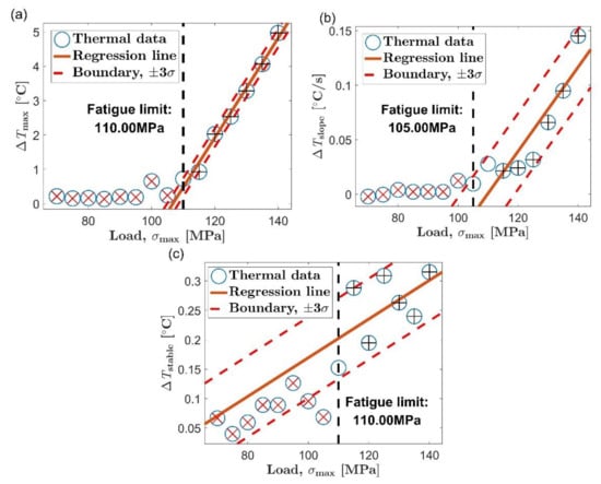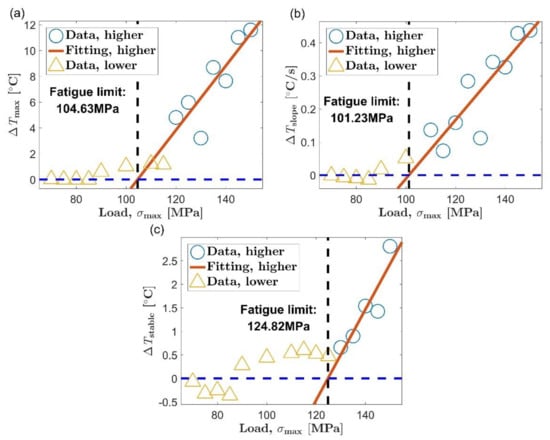 Fatigue limit evaluation using the proposed method, extrusion direction: (a) maximum temperature rise, ΔTmax; (b) initial temperature rise slope, ΔTslope; (c) mean temperature rise of stable stage, ΔTstable.