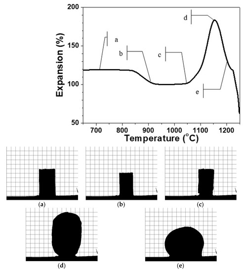 Figure 1 indicates that after non-isothermal heat treatment, the sintering curve up to 1000–1050 °C reveals no significant volume change. At the same time, the comparison between the silhouette snapshots in Figure 1b,c shows some smoothing of the surface due to the viscosity decrease.