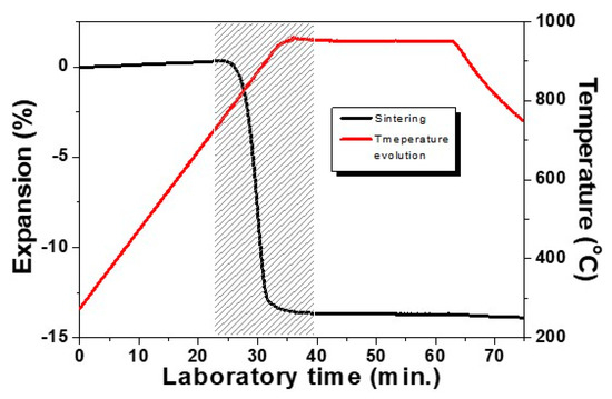 The low temperature sintering behavior of a studied glass-ceramic sample is presented in Figure 2. Results are obtained at the isothermal heat treatment step at the optimal temperature of 950 °C and with a holding time of 30 min using a modest heating rate of 10 °C min−1. The densification interval is indicated by the shaded area. This result highlights that the sample shrinks by 13% and that the sintering process is entirely completed already in the beginning of the non-isothermal step (we have 12% linear shrinkage during heating and only 1% taking place during the first 5 min of the hold). It is important to note that during the remaining 25 min, no volume changes have been observed, i.e., no deformation is carried out during the crystallization step. We have to mention additionally that at lower temperatures [5,15,23], longer crystallization times can be applied.