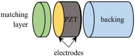 A classical single-element ultrasonic transducer (Figure 1) is composed of a piezoelectric disk, typically a PZT ceramic, with an electrode on each of its surfaces and polarized along the thickness direction, a thick backing, and one or several matching layers. The backing is added on the rear face of the ceramic disk to allow acoustic energy to flow in, thus inducing damping of the resonance. The sensitivity is therefore decreased but a higher axial resolution is achieved. On the front face, one or serval matching layers are added to match the large discrepancy in acoustic impedance between the piezoelectric ceramic (~33 MRayl) and the propagation medium (~1.5 MRayl). Therefore, more acoustic energy can flow towards the medium and the sensitivity is improved as well as the axial resolution.