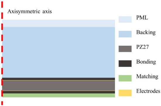 FE simulations are developed using the commercial FE software COMSOL Multiphysics® version 5.4, COMSOLAB, Stockholm, Sweden. Figure 3 shows the FE model of an intact single-element ultrasonic transducer. The backing is always much thicker than the piezoceramic disk to ensure that no reflected waves come back. To reduce the computational cost of the entire structure, a perfectly matched layer (PML) [35,36,37] is added at the rear of the backing. Chosen parameters give this polynomial stretching type PML a maximum of 109 dB attenuation for normal incidence. All simulations are developed in vacuum instead of air, because the loading effect of air on the transducer vibration is negligible [38].