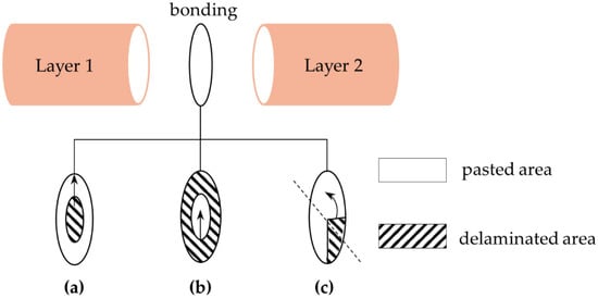 Two main cases of delaminations are studied in this work. In the first case, delaminations arise in the bonding layer between ceramic and backing, while they arise in the bonding layer between ceramic and matching layer in the second case. For each situation, three delaminations types (DT) are studied that are named respectively as DT-I (Figure 4a), a circular shape delamination, starts from the center and expands towards the peripheric zone, DT-II (Figure 4b), an annular shape delamination, starts from the peripheric zone and expands towards the center, and DT-III (Figure 4c) is a sector shape delamination with a given angle. The arrows indicate the expansion direction of the delamination.