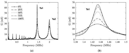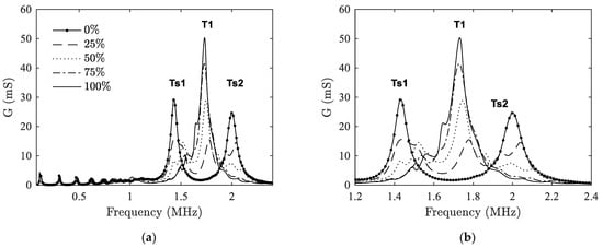 In this part, the influence of delaminations between ceramic and backing on EMA is studied. FE simulations are carried out for various delamination ratios and the results are shown in Figure 5. Since the trend of three types of delaminations are similar, DT-I type is taken as an example here. From Figure 5a we can see that the radial modes lie in the lower frequency range (<1.1 MHz), while the thickness mode lies in the higher frequency range. The thickness mode of the transducer has split into two peaks, one is at around 1.4 MHz (Ts1) and the other one is at around 2 MHz (Ts2). This is caused by the quarter-wavelength thickness matching layer in front of the ceramic when the transducer is surrounded by air.