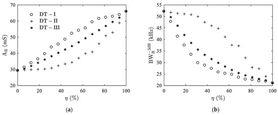 Figure 6 shows the delamination indicators extracted from the peak Ts1 of the three types of delaminations, i.e., AR and , versus the delamination ratio η. Resonance amplitude AR increases but the bandwidth decreases with the increasing η. On the other hand, it can be observed that the three delamination types show different variation patterns. The pattern of DT-III type is between those of the other two. In terms of the damaging influence of delamination on the performance of the ultrasonic transducer, such as the influence on the bandwidth, DT-I delamination makes the most, DT-III less, and DT-II even less. For example, a half delamination of the adhesive layer gives a decrease of from 52.2 kHz to 25.8 kHz (50.6%) for DT-I, 29.9 kHz (42.7%) for DT-III, and 44.8 kHz (14.2%) for DT-II.