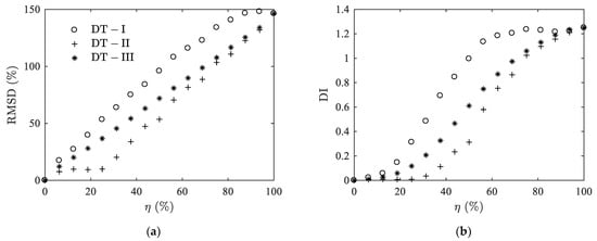 Case II: Variations of RMSD (a) and DI (b) with delamination ratio η for the thickness mode.