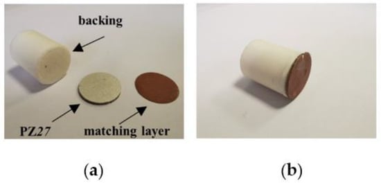 Then, for a PZ27 disk radiating in water, the ideal value of acoustic impedance for the matching layer is 4.23 MRayl. Here this matching layer is 3D printed using a copper-filled PLA material with an acoustic impedance of 4.09 MRayl, which is very close to the calculated one by (1) (discrepancy of less than 4%). The thickness of the quarter-wave matching layer is given as mm, where and are the wavelength and velocity of the longitudinal (L) waves in the matching layer. Components are bonded by an acoustic coupler phenyl salicylate (salol [26]) that is reusable since it melts at 42 °C. Thickness and material properties of passive elements are summarized in Table 2, where is the transverse wave velocity. Their diameters are the same as that of the ceramic.
