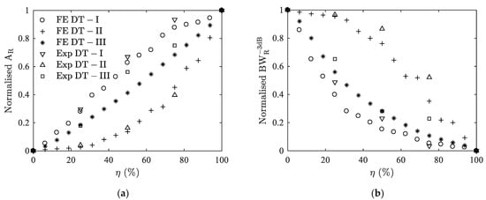 Comparison between results from FE modeling (FE) and experiments (Exp) for case I. (a) normalized AR versus η; (b) normalized versus η.