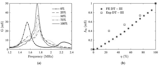 By mounting different delaminated backings (Figure 10a), the admittance curves are measured and collected. Figure 11 shows the variations of normalized AR and with delamination ratio η, extracted from the first split thickness mode peak Ts1. A good agreement is observed between numerical and experimental results. The evolution of the delamination indicators AR and coincides well and the difference between DT-I to DT-III is also confirmed by experimental results. The maximum discrepancy between experimental and numerical predicated values of AR (Table 3) are 5.7% for DT-I, 5.5% for DT-II, and 14.9% for DT-III delamination. The maximum discrepancies of (Table 4) are 8.9%, 16.9% and 12.1%, respectively, for these three types of delaminations.