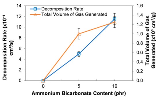 The total volume of gas generated after the decomposition increased as the ammonium bicarbonate content increased. The decomposition of ammonium bicarbonate (NH4HCO3) produces ammonia (NH3), carbon dioxide (CO2), and water vapour (H2O). The decomposition of ammonium bicarbonate is shown in Equation (4) [24]. When a higher amount of ammonium bicarbonate was added, higher volumes of ammonia, carbon dioxide, and water vapour were generated [25]. Thus, the total volume of gas generated increased as the ammonium bicarbonate content increased.