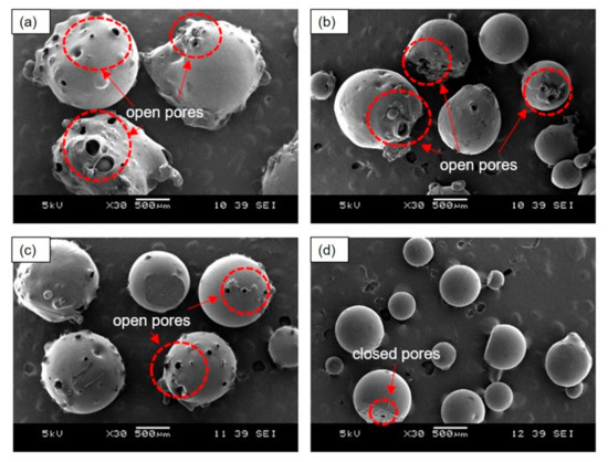 Figure 3 shows the morphology of the PEMBs prepared with different ammonium bicarbonate contents and epoxy to polyamide ratios. The results indicated that the samples with an epoxy to polyamide ratio of 10:6 with 5 phr of ammonium bicarbonate (10:6_5AB) and with an epoxy to polyamide ratio of 10:10 with 5 phr of ammonium bicarbonate (10:10_5AB) produced larger particles as compared to the samples with an epoxy to polyamide ratio of 10:6 with 10 phr of ammonium bicarbonate (10:6_10AB) and an epoxy to polyamide ratio of 10:10 with 10 phr of ammonium bicarbonate (10:10_10AB). This may have been due to the increase in the ammonium bicarbonate content from 0 to 10 phr, which caused the total volume of gases generated, following the decomposition of ammonium bicarbonate to be higher. This phenomenon induced a higher internal pressure in the single epoxy mixture droplet, which was then unable to withstand the gases that were generated, and, as a result, burst into many smaller open-pore micro-beads. For the 10:10_10AB sample, the micro-beads had closed pores, as shown in Figure 3d. It could be inferred that these droplets were able to withstand the internal pressure caused by the generated gases after the initial burst, thereby, accounting for the absence of pores on the surface of the micro-beads.