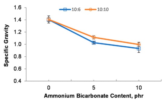 Figure 5 illustrates the relationship between the specific gravity and the ammonium bicarbonate loading with the epoxy to polyamide ratio. It was indicated that the specific gravity decreased as the ammonium bicarbonate content increased from 0 phr to 10 phr. The volume of gases generated by the decomposition of the blowing agent, and the microstructure and particle size of the micro-beads greatly influenced the specific gravity. As reported in Figure 5, the single epoxy-polyamide droplet (10:6_0AB and 10:10_0AB) without ammonium bicarbonate offered a higher specific gravity. The single epoxy-polyamide droplet was not blown and, thus, the droplet was cured as a solid macro-bead without any pores inside. This may explain the higher specific gravity that was obtained for the 10:6_0AB and 10:10_0AB samples. As expected, the addition of ammonium bicarbonate reduced the specific gravity. As mentioned in Section 3.1, the total volume of gases generated increased when the ammonium bicarbonate content was increased, leading to the production of many smaller porous particles and a reduction in the particle size. Subsequently, this reduced the specific gravity. This finding was also in agreement with References [30,31] in which the addition of a foaming agent in a polymer matrix can reduce the specific gravity of the polymer.