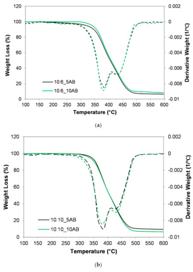 Figure 6 presents the TGA and DTG analysis of the PEMBs for different ammonium bicarbonate contents and epoxy to polyamide ratios. It was found that the PEMBs exhibited two different slopes related to two different decomposition stages. The first decomposition stage took place at a temperature of around 250–400 °C, which represented the dehydration of the hydroxyl (OH) and carbonyl (C=O) groups of the epoxy structure. Meanwhile, the second decomposition stage at around 400–500 °C represented the breakdown of the carbon backbone of the epoxy structure [33]. The 10:6_10AB and 10:10_5AB samples exhibited a higher thermal stability as compared to the other samples since they had smaller closed-pore micro-beads, which underwent a late onset of decomposition at 297 °C and 272 °C, respectively. However, the 10:6_5AB sample had an earlier onset at 222 °C and a faster decomposition rate. This sample had larger open pore micro-beads with a higher surface area and better heat diffusion [34]. Hence, it exhibited a lower thermal stability. For the effect of the epoxy to polyamide ratio, the 10:6 ratio containing 5 phr of ammonium bicarbonate (10:6_5AB) showed a lower thermal stability. However, it was reported that, with the use of 10 phr ammonium bicarbonate, the sample with an epoxy to polyamide ratio of 10:6 (10:6_10AB) exhibited a higher thermal stability. It was deemed that the 10:6_10AB sample had solid micro-beads, which burned at a slower rate than the porous micro-beads.