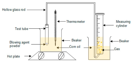 Ammonium bicarbonate with 5 and 10 phr were placed in the test tube and partially immersed in corn oil. The temperature of the corn oil was set at 100 °C. The amount of gas released through the hollow glass rod into the water in the measuring cylinder was recorded. The setup of the apparatus is shown in Scheme 2. The process was repeated for five cycles. The decomposition rate and total volume of gas generated by ammonium bicarbonate were determined by Equations (1) and (2).