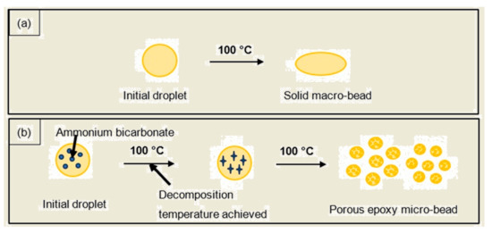 Porous micro-beads have been extensively commercialized in biomedical and structural applications due to their outstanding properties, such as low density, high surface area, high porosity, and economic value compared to solid micro-beads [1,2,3]. Their porous structure was composed of open pores or close pores. Kim and Lee [2] stated that a porous structure with a high storage capacity is an added feature for the separation of gas used in the membrane. In another research study by Li et al. [4], the porous micro-beads were used as adsorbents for the removal of dyes from aqueous solution. They claimed that this type of micro-beads increased the efficiency for absorption in solution. Various materials, such as glass, ceramic, metals, and polymers, have been used to produce porous micro-beads. The properties of the final product depend on the type of material used to produce the porous micro-beads [5]. Among the porous microbead materials, polymers dominate in many applications, including structural, automotive, electronics, and biomedical applications [6,7,8], as polymer-based micro-beads are inexpensive, and offer excellent thermal expansion and ease of fabrication [9,10]. Currently, porous epoxy micro-beads are being continuously explored by researchers due to their excellent mechanical and thermal properties, and superior chemical resistance due to the three-dimensional crosslinks formed by the reaction between epoxy and polyamide [11].