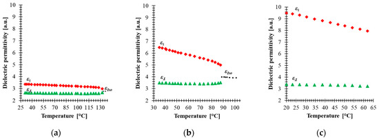 Temperature dependence of the real part of permittivity of: (a) component 2, (b) 3 and (c) 5005 mixture for 100 Hz. Red points—parallel constant of permittivity ε‖, green points—perpendicular constant of permittivity ε⊥, black points—permittivity in the isotropic state εIso.