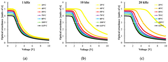 Voltage-dependent optical retardance of 5005 mixture at different temperatures (λ = 633 nm, cell gap 5 μm) for different frequencies of applied square AC signal: (a) 1 kHz, (b) 10 kHz, (c) 20 kHz.