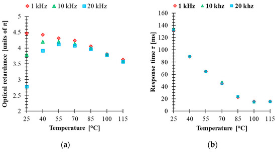 Dynamic electro-optical characterizations of the cell were carried out to study the relaxation time of the mixture. The cell was addressed with a driving voltage 10 V square-wave AC signal modulated by a low frequency square wave. That is, the applied voltage to the LC was varied between 10 V and zero to switch the cell ON and OFF during the test. The measured rise time and decay time are calculated between 90% and 10% of the maximum intensity change. The results of the relaxation times at different operating temperatures and for three different frequencies of the applied 10 V square AC signal (1 kHz, 10 kHz and 20 kHz) are plotted in Figure 4b. The response time τ presented in Figure 4b is the sum of and . At T = 25 °C, τ is equal to 130 ms, indicating a slow response of the LC mixture. As the temperature increases, the rotational viscosity of the mixture is reduced, and hence the response time tends to decrease. On the other hand, with an increase of the temperature up to 85 °C, the response time is less than 30 ms. Unlike voltage-driven LC cells, in the case of a frequency control scheme, the response time seems to be substantially independent of the applied frequency. This is another indication that the performance of devices where several levels of phase change are required with the same value of the response time can be beneficial for many applications. The dynamic response of this material can be improved by photo-polymerization, and therefore the study of stability of the LC mixture under UV irradiation should be considered.