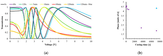 (a) Voltage-dependent transmittance and (b) phase change of 5005 mixture under UV (time of exposure: 60 s, 120 s, 5 min, 10 min, 60 min, 120 min, power 40 mW/cm2, λ = 385 nm) and blue light (time of exposure 120 min, power 40 mW/cm2, λ = 445 nm) exposition.