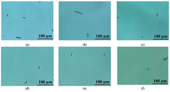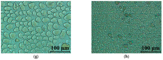 The performed UV stability test, including the observed degradation caused by UV light, have been documented by polarizing microscopy. The LC cells after exposure to UV radiation were mounted between crossed polarizers with an optical axis rotated 45° in respect to the polarizer orientation. Figure 6 presents the polarized optical micrographs images of 5005 mixture taken by the CCD camera mounted into the microscope. In Figure 6a, an LC cell filled with 5005 mixture is presented. From those results, we would like to emphasize that while the cell being exposed to UV radiation does not show degradation, it would require at least 60 s of irradiation time to trigger degradation. In the next pictures, Figure 6c–h, one can notice the degradation process of the material caused by UV light. After 60 s of irradiation time, formation of the droplets can be related to the change in chemical structure, especially triple-bond breaking in tolane and bistolane compounds. Furthermore, point and linear defects are formed, indicating discontinuities in the nematic order and disturbing the alignment of the liquid crystal molecules inside the cell.