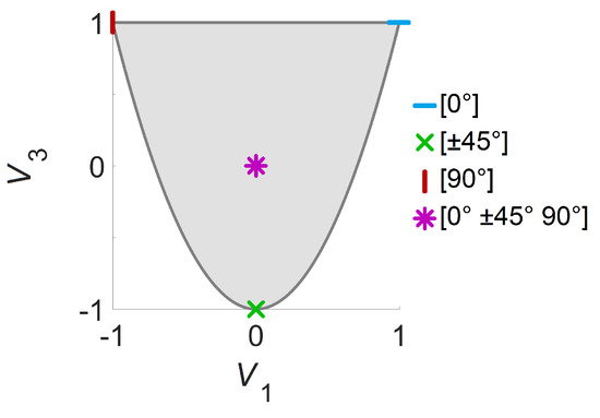 Figure 2 illustrates the feasible region of lamination parameters and sample design points with corresponding layer angles. The boundary points require certain layer angles during stacking-sequence retrieval, while many different configurations can be used for the interior points. The responses obtained with proper stacking-sequences converge to the solutions computed using the two lamination parameters for the increasing number of layers [37,38].