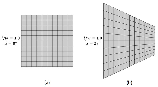 Exemplary finite element meshes for (a) non-tapered and (b) width-tapered plates with .