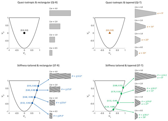 In this section, the optimal results that minimize average tip displacements of the cantilever plates under shear load are presented. Three plate types (quasi-isotropic tapered (QI-T), stiffness-tailored rectangular (ST-R), and stiffness-tailored tapered (ST-T)) and four different aspect ratios () are considered.