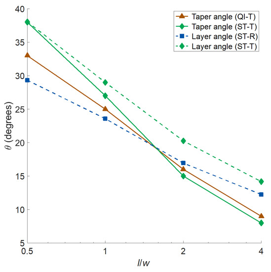 Optimal taper and layer angles vs. aspect ratio curves for different design approaches are also analyzed (Figure 5). Both optimal taper and layer angles decrease with increasing aspect ratio, where the former decreases with a greater rate. One can also note that the taper and layers angles of ST-T plates have very close values for (), while they draw apart for higher aspect ratios.