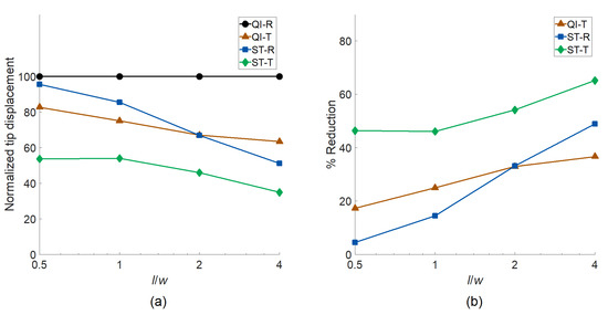 Next, the influences of aspect ratio and design strategy on the optimal responses are analyzed. Figure 6 shows (a) the normalized tip displacements of cantilever plates under shear load and (b) displacement reduction percentage with respect to QI-R plates. The results indicate that ST-T plates yield the lowest mean displacements for all analyzed cases, indicating the importance of concurrently optimizing the layer and taper angles to attain the best performance. For all design approaches, the percent reduction compared to the QI-R rises with increasing aspect ratio. Sole tapering is more effective than sole stiffness tailoring for lower aspect ratios (), where the opposite holds true for higher aspect ratios ().