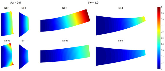Raising the value to 4.0 results in beam-like deformation profiles unlike the deflection shapes of the plates with a low aspect ratio where local effects are involved. Consequently, the relative effectiveness of sole tapering reduces, and the ST-R plate outperforms the QI-T one. The observed influence of increasing aspect ratio is related to the amplification of flexural deformation over shearing, as reported in the literature as well [8,10]. This transition in the dominant deformation mechanism also justifies the optimal fiber angle values, which are close to and for small and large aspect ratios, respectively.