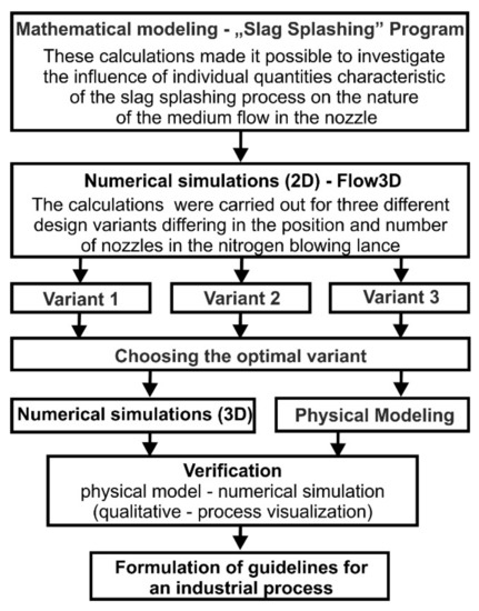 Modeling studies included computer simulations of the nozzle operation with the use of a computer program (Slag Splashing Program) based on the mathematical model of gas flow and gas-powder mixture through the nozzles, modeling with the Flow-3D computer program and a physical model. Model tests in the field of CFD calculations were carried out with the Flow-3D program, version 10 [11]. This program can be also used to model two-phase flows. It employs a modified volume of fluid method, the so-called TrueVOF [12]. This method includes the following components: a scheme to determine the location of the free surface, an algorithm to track this surface as an interface moving through the computational lattice, and tools to introduce boundary conditions on the free surface [11,12,13,14,15]. Simulations in this paper were performed for a 3D system geometry. During stage 1, the results for the converter symmetry axis cross section (2D) were analyzed for three different variants of lance nozzle arrangements. In this way, the optimum process parameters of the slag spattering could be determined. Then, the results were visualized and analyzed for the thus selected model, (step 2) for a 3D system geometry. The results of these calculations were verified using a cold physical model of an oxygen converter made on a scale of 1:10. A modified Froud number was used as a dominance similarity criterion. On its basis, the dynamic and kinematic similarity was determined by the method of scales. The results of tests carried out using the cold converter model were compared with the results of 3D numerical simulations. A good convergence was obtained for the results proving their high reliability.
