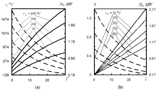 In turn, the analysis of Figure 3b reveals that with the increasing nitrogen temperature t0 (here nitrogen heating temperature), the assumed mass of oxygen g decreases [17]. For example, with the increase of t0 from 30 °C to 600 °C at a distance x = 20 calibers, the assumed mass of oxygen g decreases from 0.94 to 0.4. This phenomenon is caused by the fact that with the increase of t0 the initial pressure of mixture p0 simultaneously increases, and therefore, g decreases. This means that with the increase of temperature t0 at a distance x = 30 calibers, the power of nitrogen stream Nx increases from 0.19 MW to 0.62 MW.