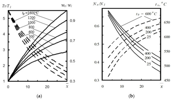 (a) Change of Tx/T1 (––) and rate wx/w1 (- ), depending on the change of temperature in the converter body tg at a different distance x from the nozzle [2] and (b) influence of nitrogen temperature t0 on temperature tx (––) and ratio Nx/N1 (- ) at a different distance x from the nozzle [17].