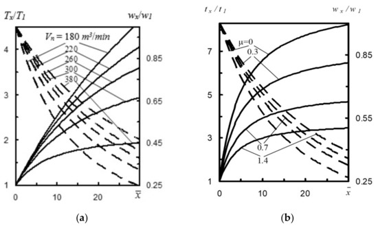 Nitrogen consumption Vn of the nozzles significantly affects the thermogasodynamic flow parameters (Figure 5a). For example, if gas consumption Vn by the nozzles increases from 180 m3·min−1 to 380 m3·min−1, then at a distance calibers, the Tx/T1 ratio decreases from 3.69 to 1.85 [17]. This is caused by the fact that with the growing value of Vn the gas mass distributed in the converter volume lowers. Therefore, with the increase of nitrogen consumption by the nozzles, stream temperature tx lowers, as does the Tx/T1 ratio. It should be also observed with the increase of nitrogen consumption Vn in the same nozzle, temperature tx decreases, and the values of rates wx and wx/w1 correspondingly increase.