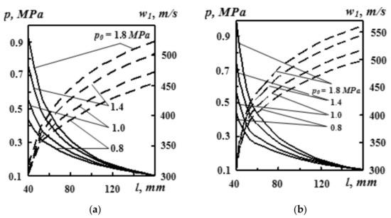 The results of the authors’ computer simulations on the influence of pressure were used for a number of unique nozzle dimensions (dmin, dkr, da). It follows from Figure 7 that with the increase of initial pressure p0, both static pressure p and gas flow rate w1 increase in an arbitrary nozzle cross section, taking into account the gas flow. For instance, in a situation when the distance from the nozzle inlet cross section is l1 = 100 mm, with the increase of pressure p0 from 0.8 to 1.8 Mpa, static pressure p grows from 0.18 to 0.22 MPa, and rate w1 increases from 455 m·s−1 to 511 m·s−1 [8].