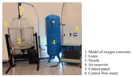 The design and construction of the physical model of the oxygen converter were realized according to the principles of similarity theory [23]. The physical model of the oxygen converter is made on a linear scale SL = 1:10 from transparent materials of PMMA type due to which visualization investigations are possible. The model is equipped with a specialized control and control apparatus. This element of the model includes a precise regulator of airflow blown through the lance and air supply system.