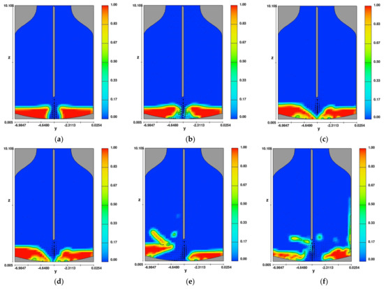 The analysis of the results presented in Figure 9 reveals that after a time of 0.05 s (Figure 9a,b), a stream of flowing gas is introduced into the layer of liquid slag, but its power is insufficient to place the slag on the walls of the converter and detach the whole mass from the bottom of the converter. A similar phenomenon was observed as the slag splashing process continued (Figure 9c,d). The gas stream coming out of the nozzle had the energy to tear off about 40% of the liquid slag in the oxygen converter and transport it toward the walls (Figure 9e). It was observed (Figure 9f) that some slag was stuck to the right wall of the converter at a height of 6–6.5 m.