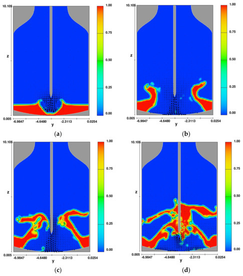 It follows from the results of simulation performed for the time of 0.05 s (Figure 10a), that the slag scattering is more uniform and effective than in the previously presented calculations (Figure 4a). The energy of gas streams coming out of the nozzles tears off the slag from the bottom of the converter already in the initial stage and moves it toward the walls. It is also noted (Figure 10b—time 0.45 s) that about 85% of the slag volume breaks away from the bottom and moves toward the oxygen converter walls. However, after time 0.65 s (Figure 10c) a negative phenomenon is observed. The power of the gas stream from the lance with four nozzles is not sufficient to disperse the slag to the upper parts of the refractory lining of the oxygen converter. The slag moves toward the lance, and after 0.85 s (Figure 10d), it falls back to the bottom of the device.
