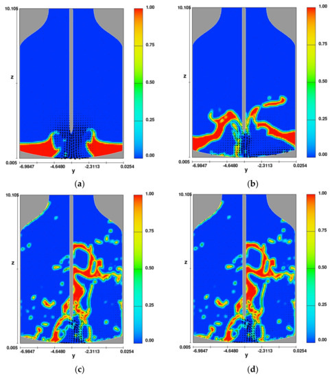 The analysis of the CFD simulation results (Figure 11) reveals that after a time of 0.1 s, the spray is very uniform, while the slag is lifted and moved toward the oxygen converter walls (Figure 9a). This is expected from the point of view of the effectiveness of the further spattering process. At this stage, the slag is initially stirred up by the interaction between the liquid phase (slag) and the gas phase (nitrogen stream). At this point, the gas phase energy should be sufficient to initiate the slag movement toward the converter walls and sufficiently dispersed to make the excitation relatively uniform over the whole surface of the converter. Analyzing further results of the slag splashing process (Figure 11b), i.e., after the time of 0.45 s, the slag mass inside the oxygen converter is almost completely removed. The further course of the process only confirms that the parameters and lance design were chosen correctly (Figure 11c). Presented calculation results show that part of the deposited slag falls back to the bottom of the converter but subsequent calculation steps confirm that the power of the outgoing gas stream is sufficient to re-lift the falling part of the slag to a height of almost 9.0 m (Figure 11d).