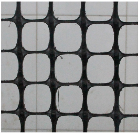 Geogrid has been playing an important role in solving geotechnical problems due to its high strength and elongation ratio [10,11,12,13,14]. In pavement applications, geogrid is commonly used to provide safety for traffic and increase the service life of roads. Sun et al. [15] showed that a geogrid placed at unpaved roads reduced both the base course and subgrade permanent deformations and changed the radial stress distributions within the base course and subgrade. Geogrid has been also employed as an anti-reflective-cracking system in the reconstruction of pavement. Khodaii et al. [16] studied the effects of geosynthetic reinforcement on mitigating reflection cracking in asphalt overlays and found that a geogrid placed at one-third the height of overlay thickness could obtain the optimum benefit. Hadi and Al-Hedad [17] investigated the flexural fatigue behavior of geogrid-reinforced concrete pavements subjected to cyclic loads and developed an equation for designing geogrid-reinforced concrete pavements. Meski and Chehab [18] conducted four-point bending tests of geogrid-reinforced concrete beam and assessed the feasibility of placing geogrids in thin concrete overlays. Tang et al. [19] showed a failure model of geogrid-reinforced Portland cement concrete. Al-Hedad and Hadi [20] showed that geogrid-reinforced concrete slab had improved flexural performance and cracking resistance. Mohamed et al. [21] conducted a four-point bending test on geogrid-reinforced concrete slabs and indicated that triaxial geogrids could provide lower deflection values and higher first-crack load values for geogrid-reinforced concrete slabs. Meng et al. [22] studied the flexural behavior of geogrid-reinforced pervious concrete beam with a different geogrid layer number at various positions. The studies of geogrid-reinforced pavement mainly focus on asphalt or concrete pavement at present. Little research has been done on geogrid-reinforced pervious concrete pavement. On the one hand, geogrid can provide additional tensile strength for pervious concrete to restrain cracking. On the other hand, water can pass though the aperture structure of geogrid without affecting the permeability of pervious concrete. Moreover, as a polymeric material, geogrid has a good corrosion resistance, and would not be rusted in water like steel. Obviously, these benefits make it feasible to use geogrid as reinforcement in pervious concrete.