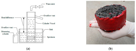 Based on Darcy’s law, the equipment for the permeability test was designed as shown in Figure 4a. Unreinforced and geogrid-reinforced cylindrical specimens with a size of Φ 100 mm × 50 mm were used in the permeability tests. Industrial butter was smeared around the sides of specimens to ensure that the water only permeated from the upper surface to the lower surface of specimens, as shown in Figure 4b. The permeability coefficient of pervious concrete was calculated as follows: