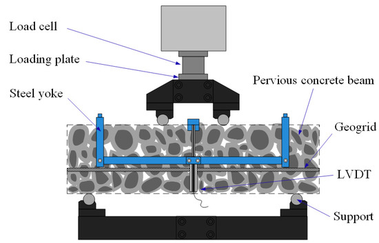The four-point bending tests were carried out using a hydraulic testing machine with a maximum load capacity of 1500 kN to evaluate the flexural behavior of the geogrid-reinforced beams. Figure 6 shows the four-point bending test setup. The dimension of the beam was 550 mm × 150 mm × 150 mm. The span length between the two lower supports was 450 mm, while the length between the two upper supports was 150 mm. It is worth noting that the casting surface of beam should not be used as a supporting surface, due to its uneven surface. The beam was loaded with a displacement rate of 0.01 mm/s. The vertical displacement at the mid-span of beam was obtained by a linear variable differential transformer (LVDT), which was installed on the steel yoke [29]. This study tested 36 beams with different coarse aggregate sizes, geogrid positions, and geogrid layer numbers, including three replicates for each type of beam.