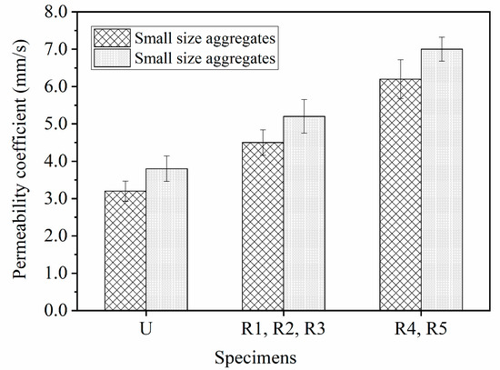 The permeability coefficient is the basic feature to reflect the permeability of pervious concrete. Figure 7 shows the permeability coefficients of pervious concrete specimens with different coarse aggregate size, geogrid position, and geogrid layer number. Test results indicate that the specimens with large-size aggregates had higher permeability coefficient than those with small-size aggregates. In pervious concrete, the coarse aggregates wrapped in cement paste bond with each other to form a porous structure. The number of conjoint points between aggregates determines the permeability of pervious concrete. As compared with the small-size aggregates, there are fewer conjoint points between the large-size aggregates in pervious concrete, which leads to the higher permeability. The permeability coefficients of unreinforced pervious concrete specimens with small- and large-size aggregates were 3.2 mm/s and 3.8 mm/s, respectively.