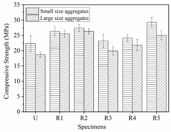 Figure 8 shows the compressive strength of pervious concrete specimens at a curing time of 28 days. The compressive strengths of pervious concrete with small-size aggregates and large-size aggregates were 22.3 MPa and 18.7 MPa, respectively. Apparently, the number of conjoint points between aggregates will influence the compressive strength of pervious concrete. Owing to having more conjoint points, the pervious concrete with small-size aggregates had higher compressive strength than that with large-size aggregates.