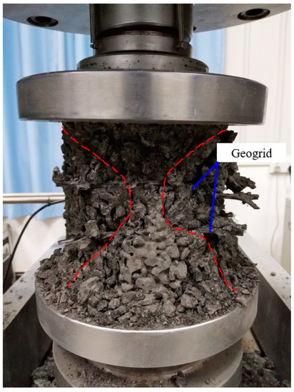 Horizontal tensile stress occurred in pervious concrete under uniaxial loading. Then, the vertical micro cracks generated, propagated, and coalesced with other micro cracks until the specimen’s failure. When geogrid was placed in pervious concrete, the geogrid brought additional tensile strength to the pervious concrete with the help of the geogrid’s aperture structure; it also reduced the conjoint points between aggregates. While the geogrid redistributed the stress to restrain the generation and propagation of cracks, the gain of compressive strength provided by geogrids could offset the loss of strength caused by the decreased conjoint points. As a result, the geogrid-reinforced pervious concrete has improved compressive strength as compared with the unreinforced pervious concrete. Moreover, the geogrid position and layer number could influence the compressive strength of pervious concrete. Figure 8 shows that placing the geogrid at the one-third height of the pervious concrete cube obtained the highest compressive strength when one layer of geogrid was placed. As compared with the unreinforced pervious concrete specimen, the compressive strengths of reinforced specimens SR2 and LR2 increased to 27.4 MPa and 26.3 MPa, respectively. During the uniaxial loading process, the upper- and lower-end faces of pervious concrete cubes were subjected to the friction of the loading plate. The farther away from the upper- and lower-end faces, the less affected by friction was the part in the specimen. The middle part of the specimen will produce the maximum lateral displacement, which results in the failure model of pervious concrete as shown in Figure 9. As compared with specimen R4, the geogrids in R5 were closer to the bulge part on the middle of the specimens. Therefore, the specimen R5 had higher compressive strength than R4. General speaking, Figure 8 shows that the pervious concrete reinforced with one layer of geogrid had higher compressive strength than those reinforced with two layers of geogrid. This resulted mainly because the gain of compressive strength provided by the second geogrid could not offset the loss of strength caused by the decreased conjoint points. However, it should be noticed that specimen SR5 had higher compressive strength than the specimens reinforced with one layer of geogrid. The possible reasons are listed below. Firstly, as compared with the large-size aggregates, the small-size aggregates had more conjoint points, which resulted in the increased compressive strength. Secondly, the positions of geogrid in SR5 were conducive to restraining the tensile stress. The combined effect of the aggregate size, geogrid position, and layer number led to the high compressive strength of the specimen SR5.