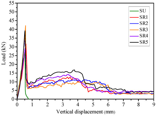 The load-vertical displacement curves of the pervious concrete beams with small-size aggregates and large-size aggregates are shown in Figure 10 and Figure 11, respectively. The load-vertical displacement curves show that the unreinforced pervious concrete beam was brittle and had no post-cracking performance. The load of the unreinforced beams SU and LU increased linearly with the increase of vertical displacement, followed by a steep drop. The flexural strengths of the beams SU and LU were 3.7 MPa and 3.4 MPa, respectively.