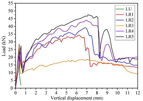 Figure 10 and Figure 11 also show that the coarse aggregate size influenced the shape of the load-vertical displacement curve of the pervious concrete beam. On the one hand, the load-vertical displacement curves of the geogrid-reinforced pervious concrete beams with large-size aggregates had an upward shift at the post-peak stage as compared with those with small-size aggregates. The second peak load of the reinforced beams with large-size aggregates was almost 3 times higher than those beams with small-size aggregates. For example, when the geogrids were placed at both the one-third and two-thirds heights of the beam, the second peak load of beam LR5 was 47.6 kN, while that of beam SR5 was only 16.7 kN. On the other hand, the second peak load of the reinforced beam with large-size aggregates was higher than the first peak load, which was contrary to the beam with small-size aggregates. Apparently, the geogrid-reinforced beam with large-size aggregates had remarkable post-cracking performance.