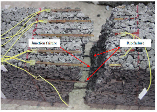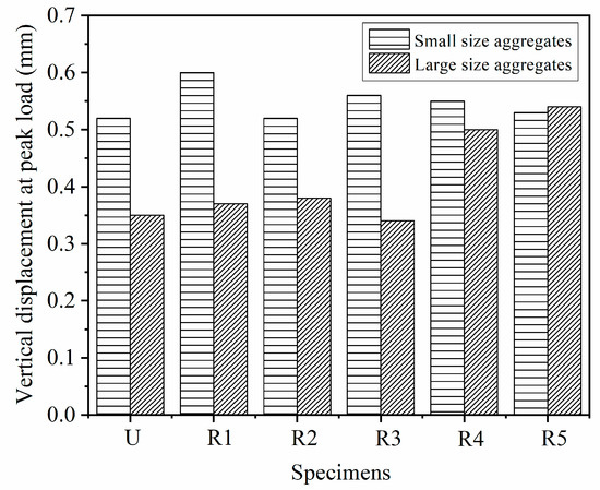 Figure 15 shows that the reinforced beams with small-size aggregates had higher than that with large-size aggregates. The geogrid used in this study had a mesh size of 40 mm × 40 mm. More 5–10 mm aggregates could fill in the apertures of geogrid as compared with the 10–15 mm aggregates. There were more conjoint points between the small-size aggregates in reinforced pervious concrete beam than that between large-size aggregates. As a result, the small-size aggregates were better interlocked with geogrids in pervious concrete beam thanks to the increased conjoint points as compared with the large-size aggregates. The good interlock between the geogrids and the small-size aggregates could make full use of the tensile strength of geogrid to restrain cracking and improve flexural strength, which resulted in the high index of the reinforced beam. It is apparent that the 5–10 mm aggregate is conducive to improving the pre-peak flexural behavior of the geogrid-reinforced pervious concrete beam as compared with the 10–15 mm aggregates.