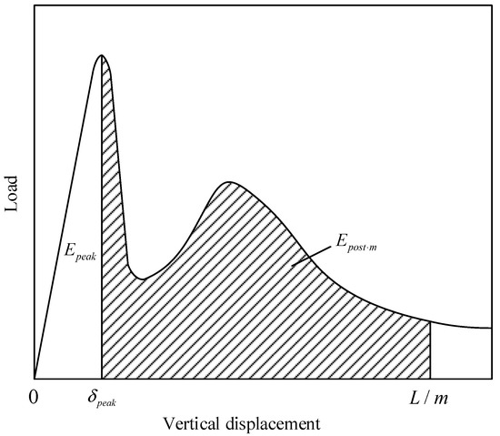 Flexural toughness is a major index to reflect the flexural behavior of geogrid-reinforced pervious concrete. However, the accepted flexural toughness evaluation methods are based on fiber-reinforced concrete [23,24,25]. Besides energy absorption, dimensionless indices related to energy absorption capacity, and equivalent flexural strengths as prescribed by post-cracking deflections or other parameters are also usually used to describe the flexural behavior of fiber-reinforced concrete. ASTM C1018 [26], JSCE SF-4 [27], and post-crack strength (PCS) [28] are common methods to evaluate the flexural toughness of fiber-reinforced pervious concrete by bending test with unnotched beam. The dimensionless indices in the ASTM C1018 method [26] can effectively evaluate the flexural toughness of specimens at different stages without the limit of the loading conditions and specimen sizes. Nevertheless, there are some difficulties in determining the initial crack point. The JSCE SF-4 method [27] used the equivalent flexural strength up to a certain vertical displacement to evaluate the flexural toughness of beams. This method avoided the influence of first crack vertical displacement on toughness evaluation. However, using the entire area under the load-vertical displacement curve made it difficult to distinguish the contributions of concrete and reinforcement to the flexural toughness. Meanwhile, the dimensional index resulted in specimens of different sizes or under different loading conditions being incomparable to each other. Benthia and Trottier [28] proposed the PCS method to evaluate flexural toughness by calculating post-peak equivalent flexural strength. Besides the benefit that the first crack vertical displacement was not considered, the PCS method highlighted the effect of reinforcement on post-peak performance. However, the effect of the reinforcement on the pre-peak stage was not considered. Although the flexural toughness evaluation methods of fiber-reinforced concrete can be used as references for geogrid-reinforced pervious concrete, clearly, an alternative method is also needed for geogrid-reinforced pervious concrete.