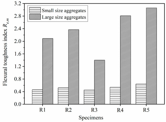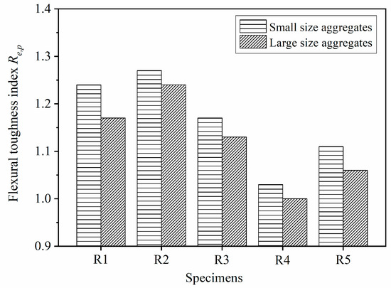 The influence of geogrid position and layer number on the pre-peak flexural performance of the geogrid-reinforced pervious concrete is also reflected by the pre-peak flexural toughness index . Figure 15 shows that the magnitudes of pre-peak toughness index of the reinforced beams with different aggregate sizes were in the following order: R2 > R1 > R3 > R5 > R4. The geogrid-reinforced pervious concrete beam R2 had the highest . The placement of geogrid at one-third the height of the pervious concrete beam could obtain the optimum flexural performance at the pre-peak stage. In addition, the index of the geogrid-reinforced pervious concrete beam decreased when the geogrid layer increased from one to two. The placement of geogrid decreased the conjoint points between aggregates in geogrid-reinforced concrete, resulting in an increase of porosity [22,33]. As mentioned in Section 3.1, the pervious concrete reinforced with two layers of geogrids had higher porosity than that reinforced with one layer of geogrid. While the gain of flexural strength provided by the second geogrids could not offset the loss of strength caused by the decreased conjoin points, the index of beams R4 and R5 were lower than beams R1 and R2, respectively. Furthermore, placing the geogrids at both the one-third and two-thirds heights could obtain better pre-peak flexural behavior when two layers of geogrids were placed in pervious concrete.